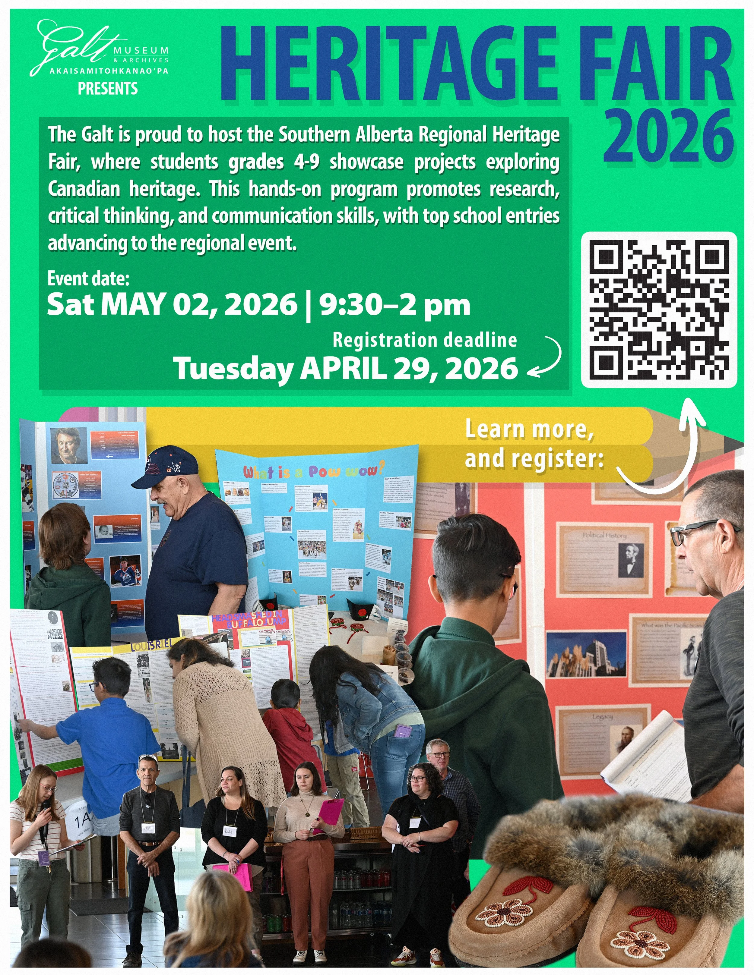 The Galt is hosting the Southern Alberta Regional Heritage Fair for students up to grade nine. The fair program encourages students to explore Canadian heritage in a dynamic, hands-on learning environment. Preparing and presenting a heritage fair project helps students develop critical thinking, historical thinking, writing, research, performance, and public speaking skills. These projects are initially shown in the schools and the best are chosen to present at the Southern Alberta Regional Heritage Fair.