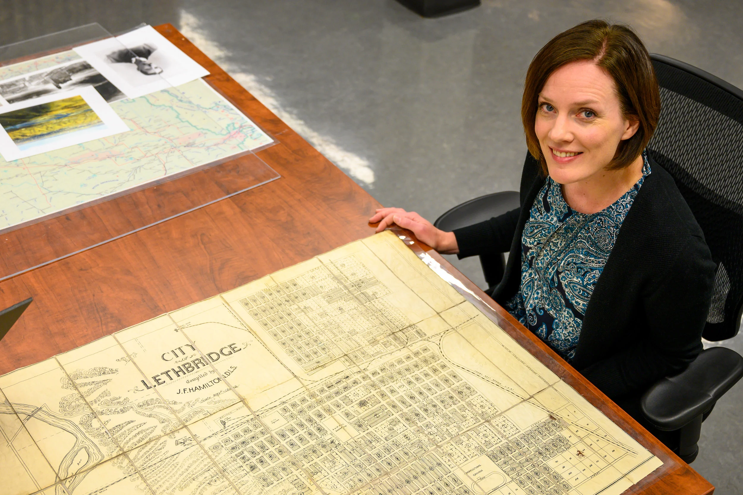 Curator Aimee Benoit with a 1909 map of Lethbridge.