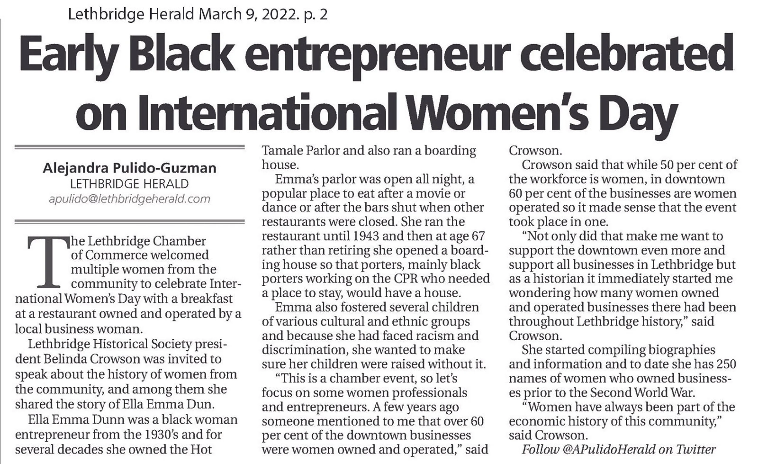 “Diners remember Emma as a handsome, neat and tidy Black woman, smartly clothed in a black dress, white apron, and white collar. Her specialty was hot tamales, described as hamburger meat rolled in a fresh corn leaf, tied at either end, rolled in cornmeal, and covered with a spicy sauce of ripe olives, tomatoes, and other ingredients.” - The Mathesis Club of Lethbridge, 100 Years in 100 Women | 1885 - 1985 ,